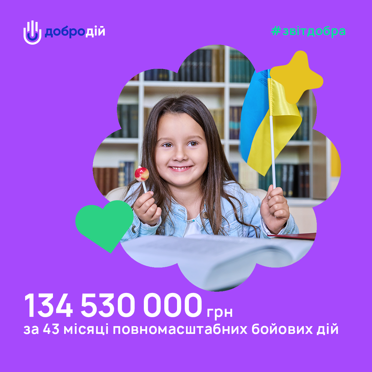 Since Russia's full-scale invasion of Ukraine began, the charity DobroDiy has provided assistance totaling UAH 134,530,000. These funds were directed to: