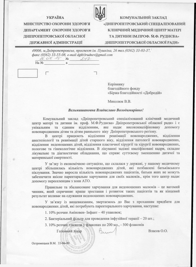 На данный момент в Днепропетровском клиническом центре матери и ребенка им. Руднева (3-я детская больница) находится около 10 новорожденных с различными патологиями внутренних органов. От этих малюток родители либо отказались, узнав о страшном диагнозе, либо существуют лишь «на бумаге» - отказ не пишут, но и ребенку никак не помогают, а только получают за него пособие «по инвалидности». Чтобы выходить таких малышей ежедневно необходимо дорогостоящее внутривенное питание и глюкоза, купить которые им просто некому. Чтобы спасти этих «ничейных» малышей, врачам приходится идти на крайности и кормить их тем питанием, что остается после тех деток, о которых заботятся родители.Цель проекта – собрать 24 984, 08 гривен, чтобы обеспечить 40 упаковок внутривенного питания «Аминовен», фильтры для введения этого питания и раствор глюкозы для недоношенных отказников