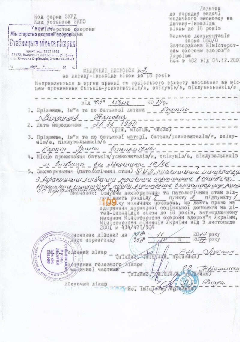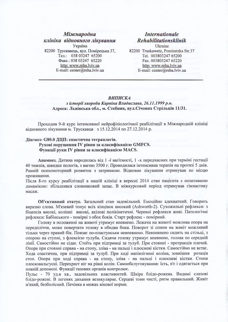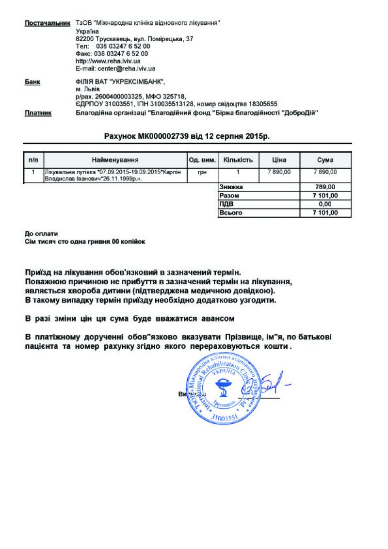 В результате халатности врачей Дрогобычевского роддома Владик Карпин при родах получил черепно-мозговую травму, был заражен стрептококком и в возрасте 14-и дней ему удалили пупочную вену. Как результат – ДЦП, из-за которого даже в свои 15 лет парень не сидит, не разговаривает и не обслуживает себя. Трагедия в том, что доходов одинокой мамы Владика, оказавшейся с двумя детишками на руках, едва хватает на питание, а вот на лечение сына, от которого напрямую зависит, сможет ли он оставить инвалидное кресло – деньги брать просто не откуда. Врачи видят прогресс в развитии Влада, но если 7 сентября у него не получится посетить запланированный курс реабилитации – все наработки просто сойдут к нулю.Цель проекта – до 7 сентября собрать 7 101 гривну, чтобы Влад прошел реабилитацию и сделал прорыв в борьбе с тяжелым ДЦП