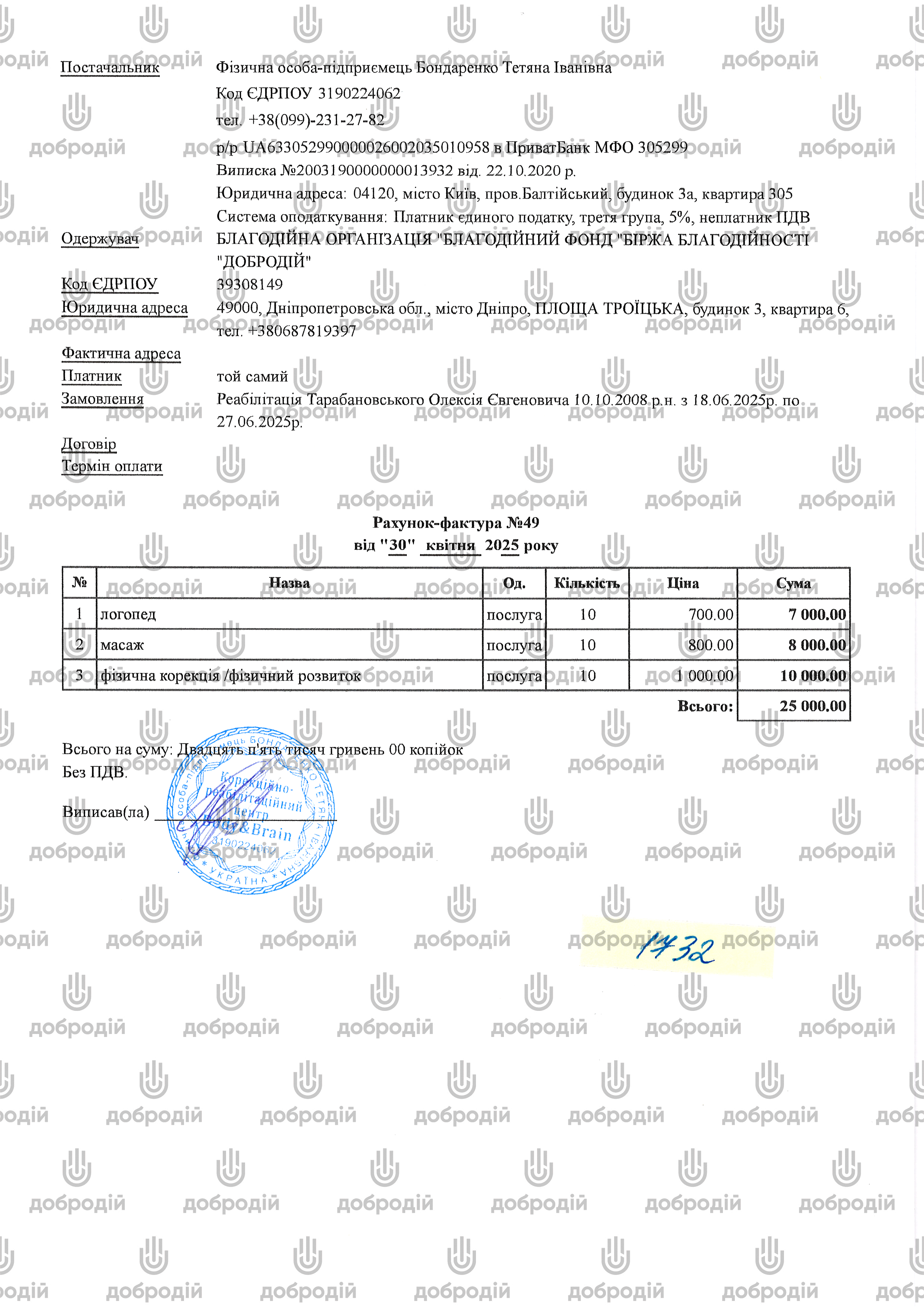 BENEFICIARY: CF "DOBRODIY" CHARITY EXCHANGE