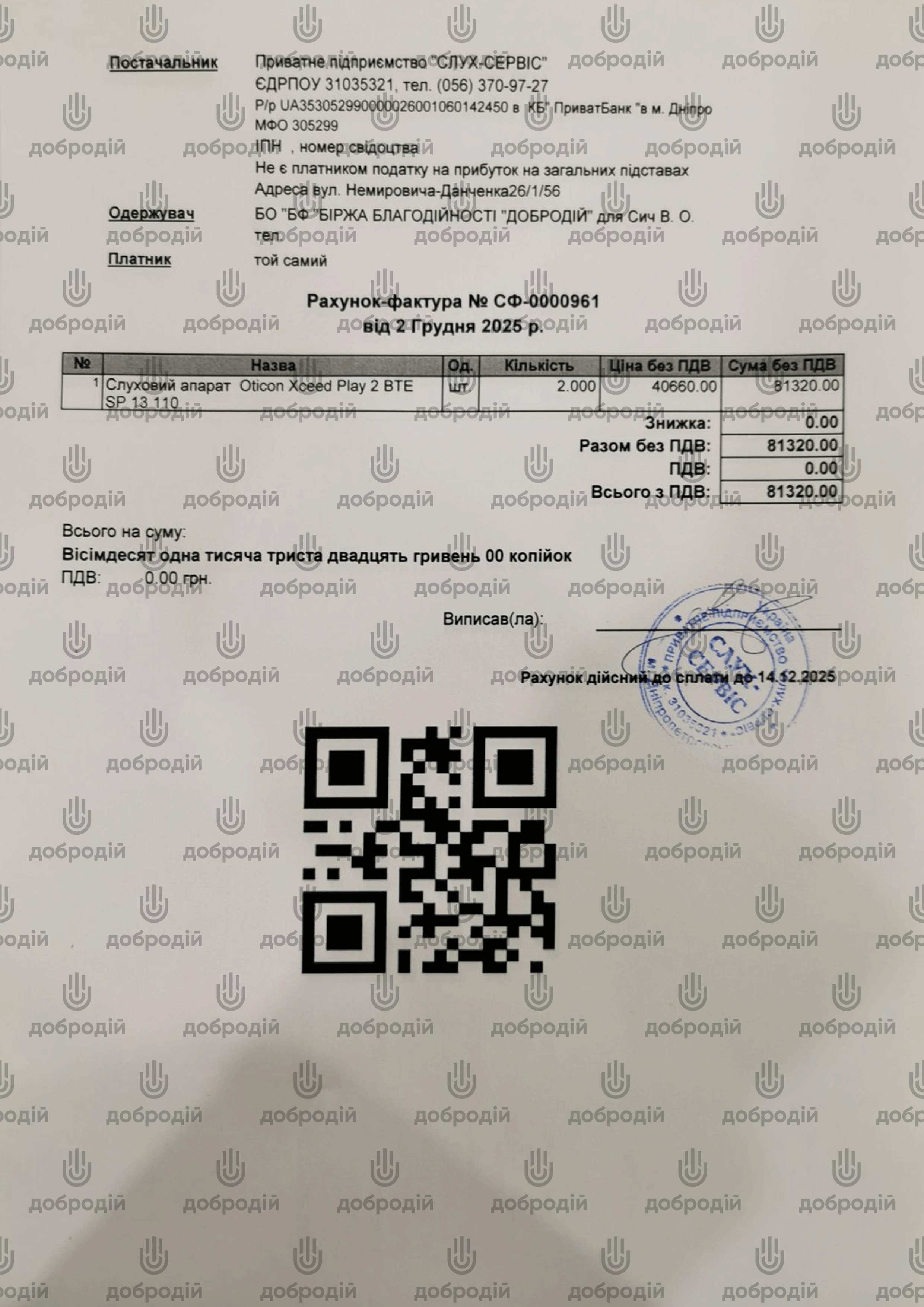 The goal of the project: to raise UAH 81,320 for the purchase of Oticon Xceed Play 2 BTE SP 13 110