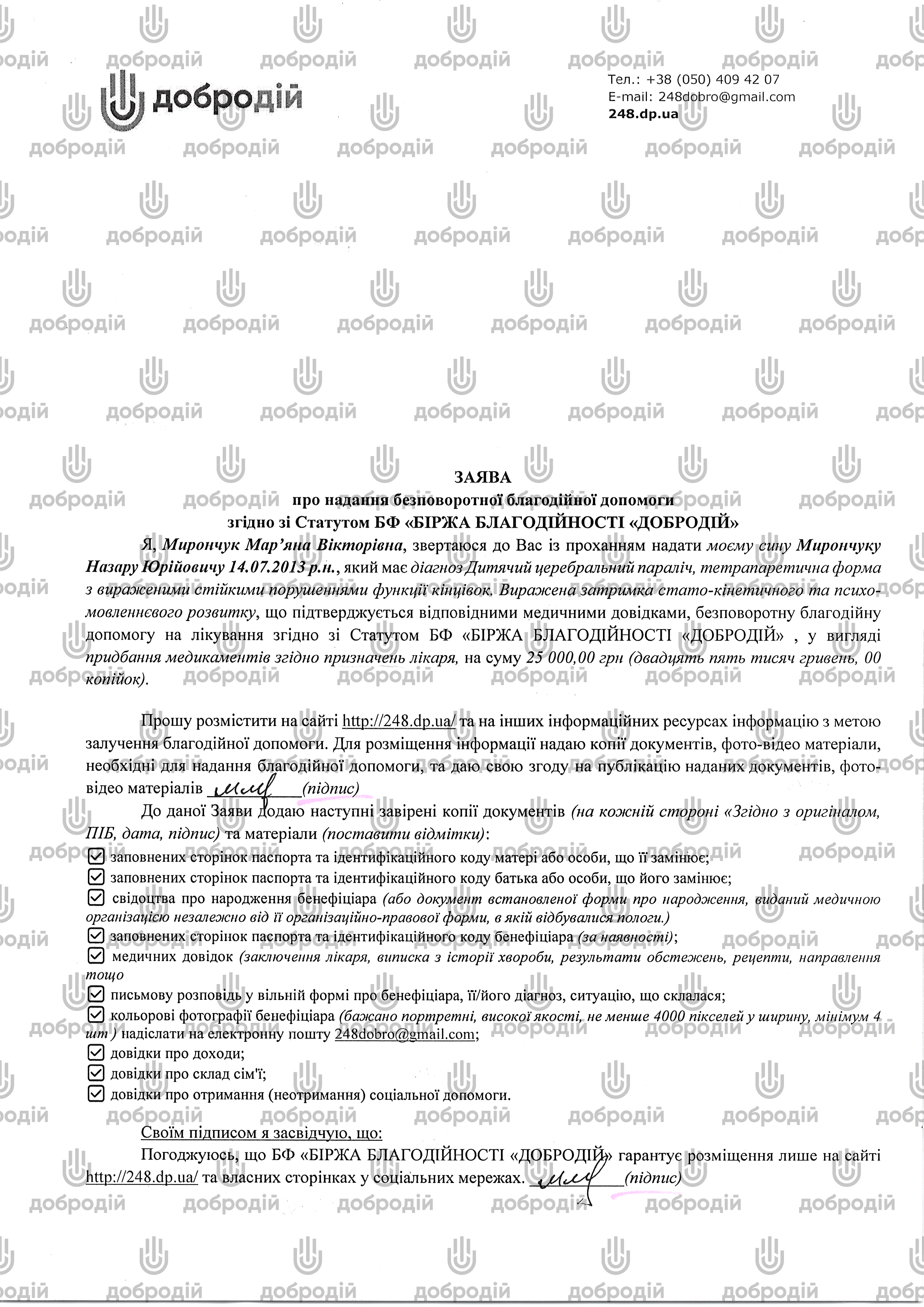 PAYMENT DETAILS: "Donation for Nazar Myronchuk (project No.1816)"