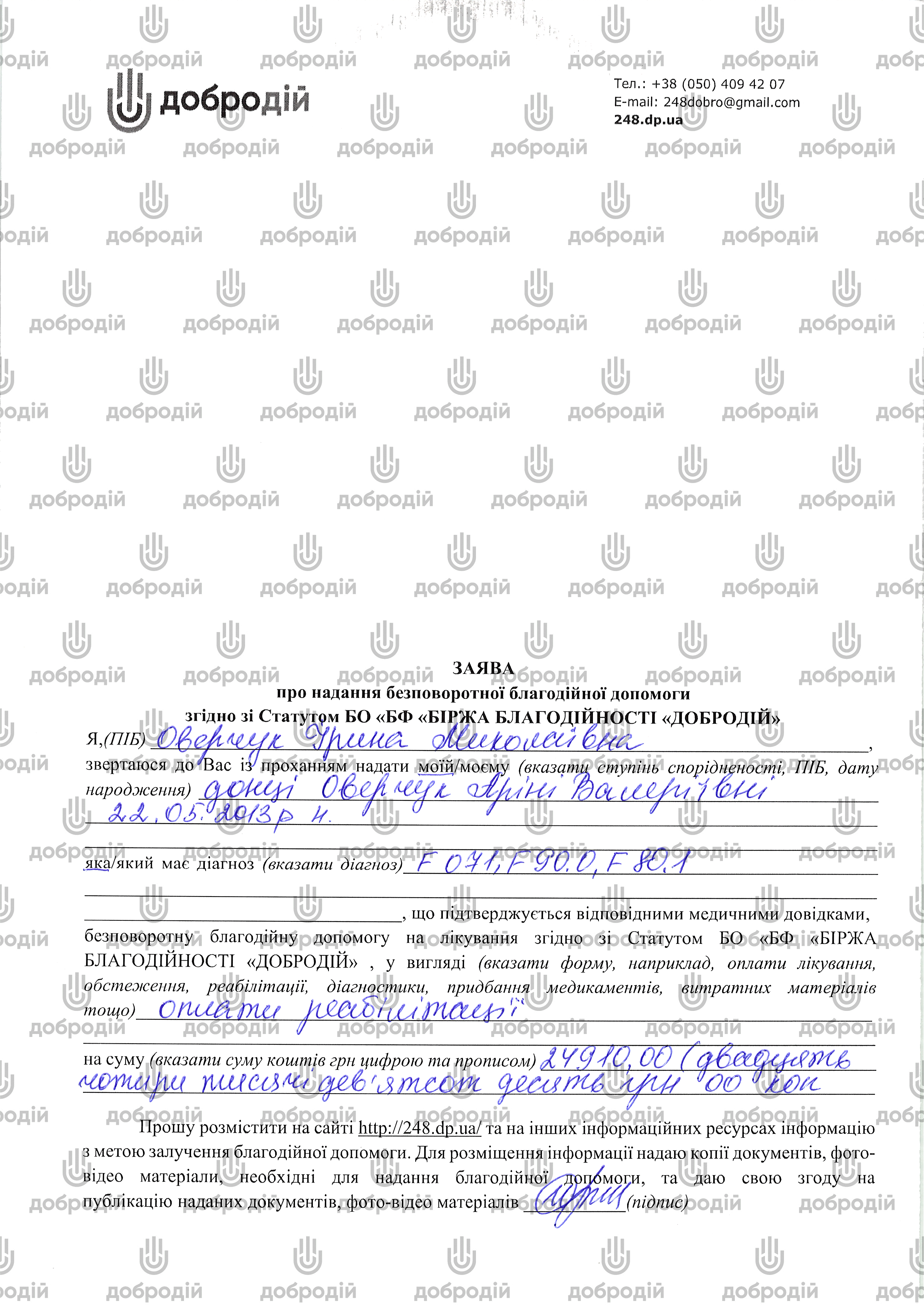 PAYMENT DETAILS: "Donation for Arina Overchuk (project No.1832)»