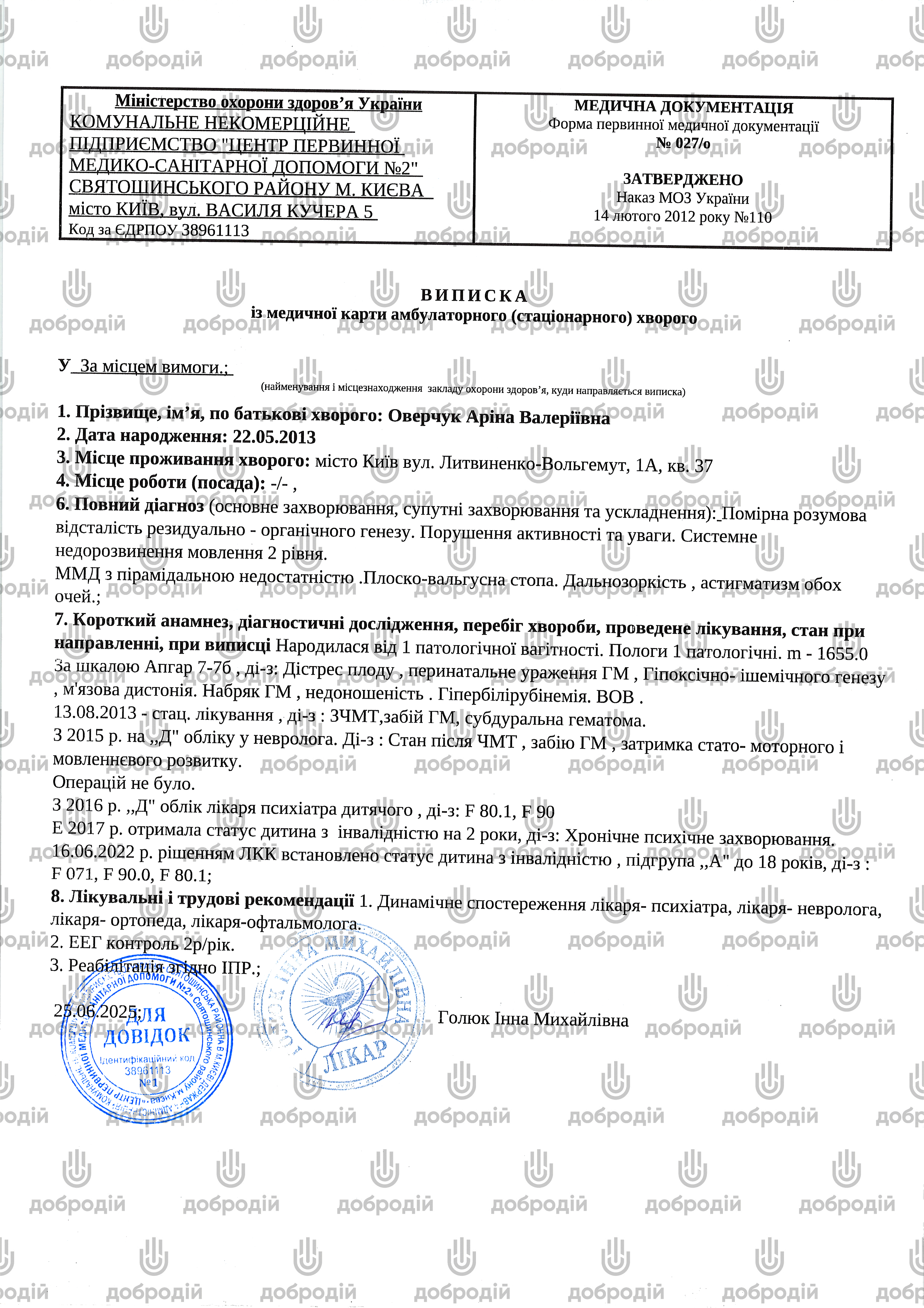 Arina is under the care of a paediatric neurologist and psychiatrist. She has been diagnosed with delayed psychomotor and speech development, moderate intellectual disability, impaired activity and attention, and systemic speech impairment. She also has vision and posture problems.