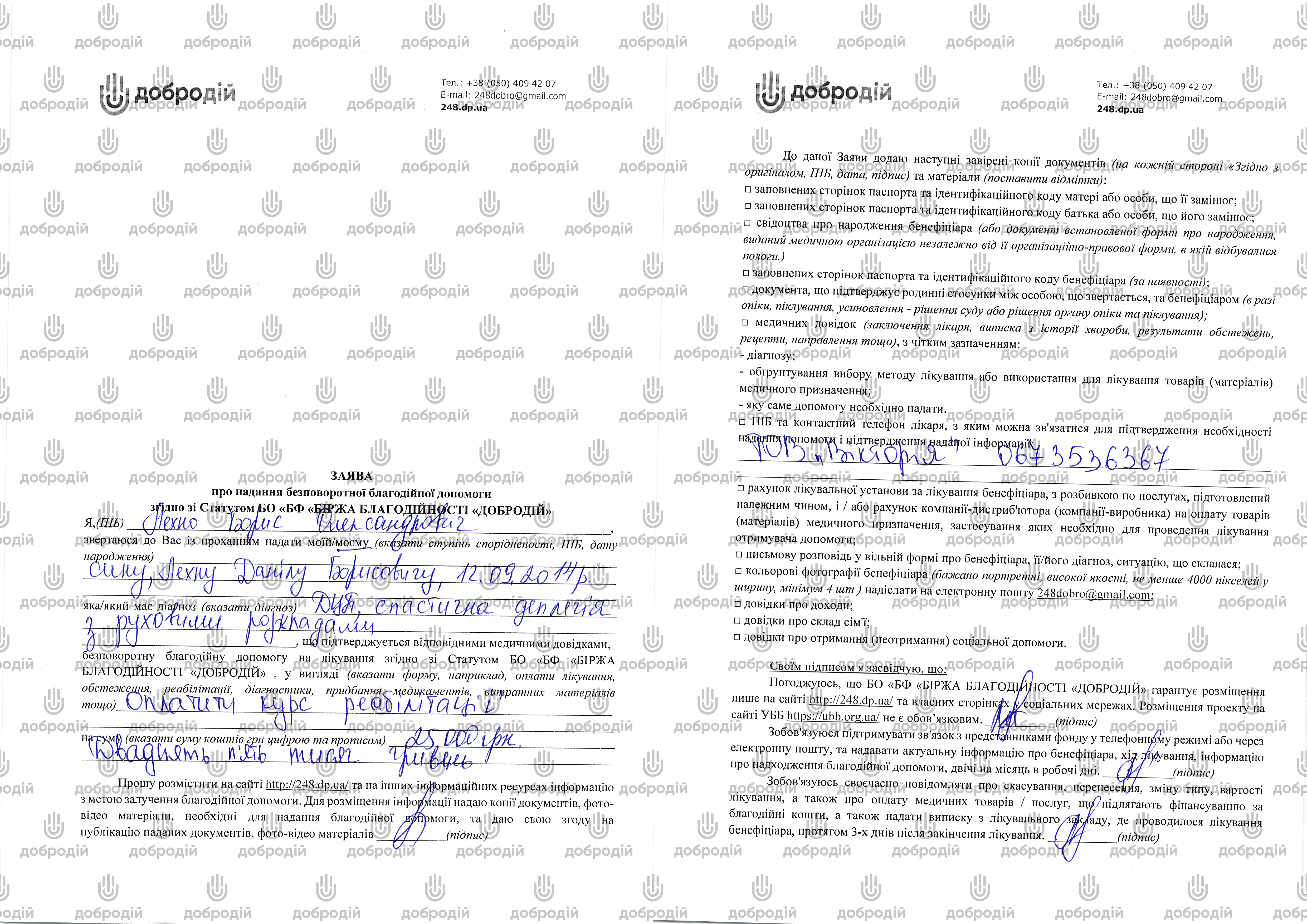 PAYMENT DETAILS: "Donation for Danil Lekhno (project No.1833)»