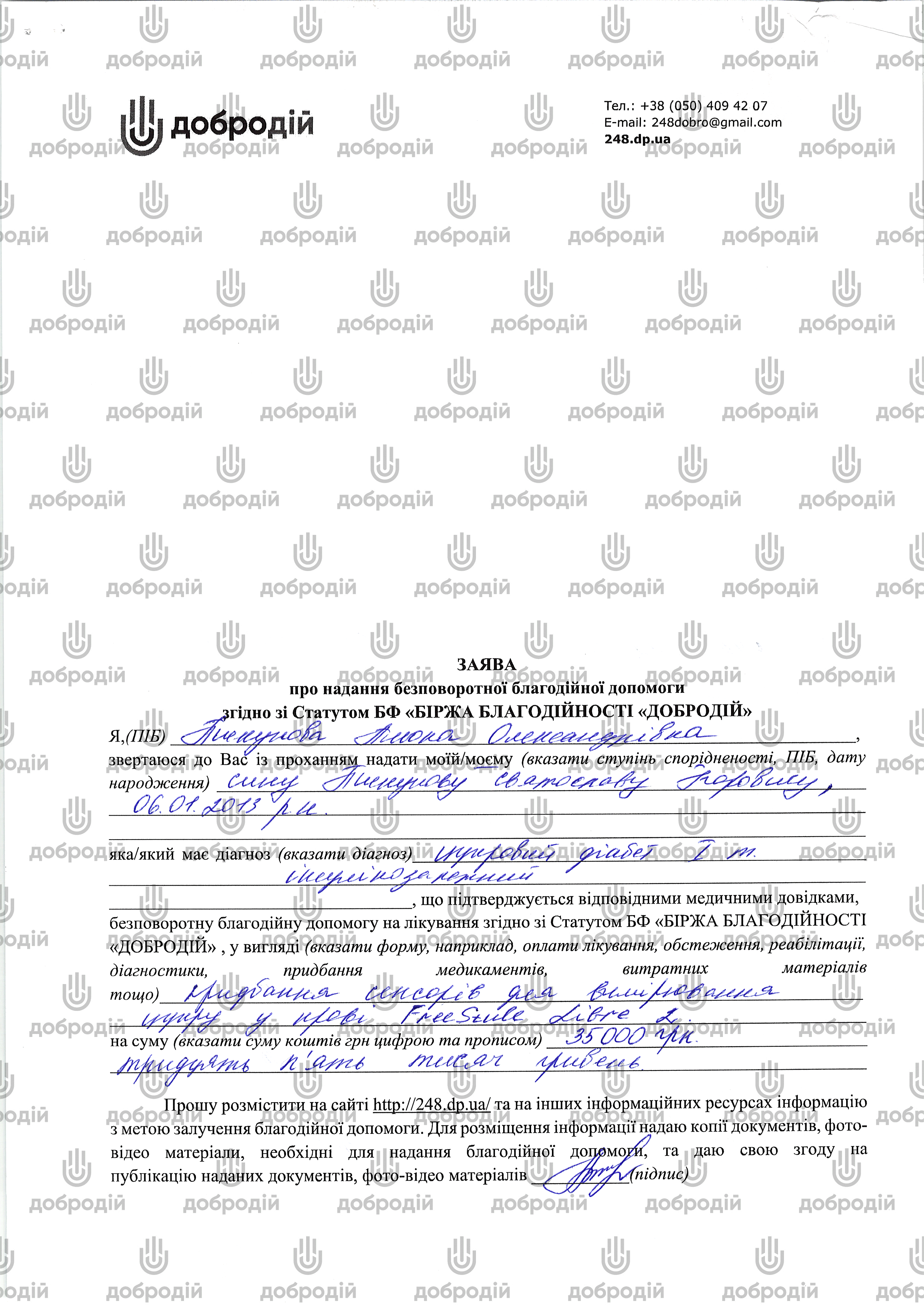 Payment purpose: “Charitable contribution for Svyatoslav Pyskunov (project No. 1866)”