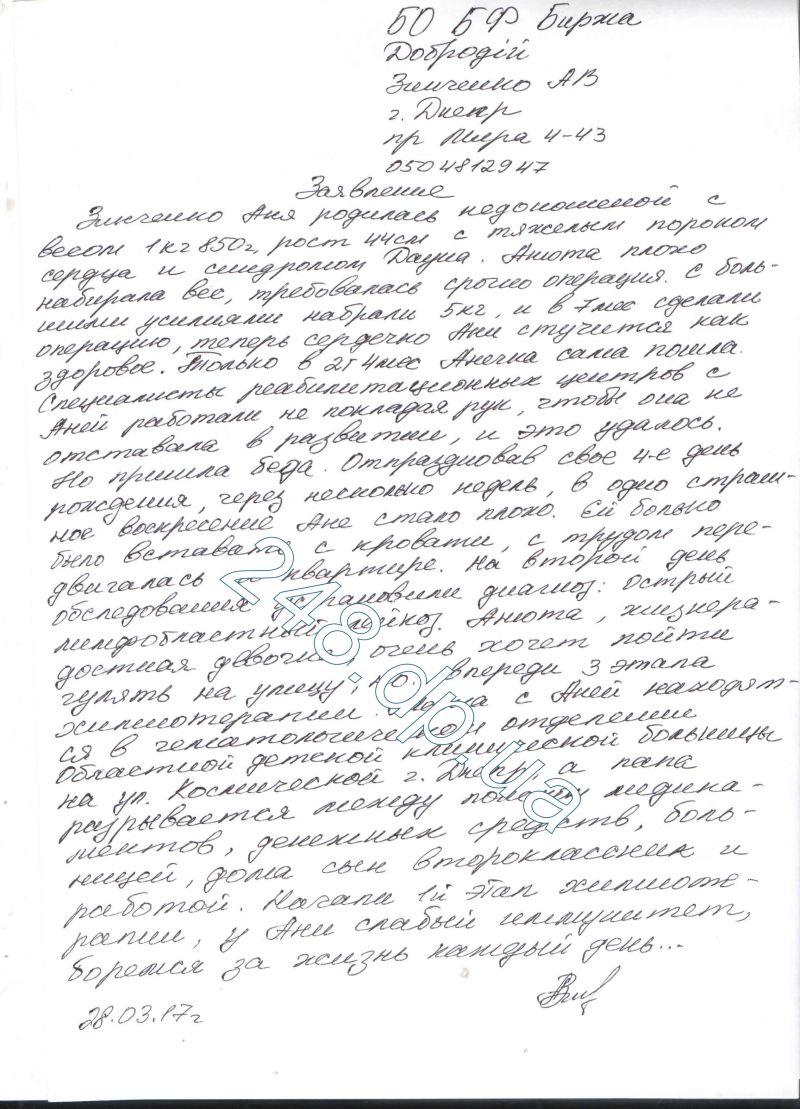 Ане Зинченко всего 4 года, но вся ее жизнь – постоянная борьба, в которой этой хрупкой девочке пока что удавалось побеждать. Анюта родилась недоношенной, с критически низкой массой тела, синдромом Дауна и пороком сердца. Врачи не давали ей даже 2-х из 10-ти шансов, но Анюта набрала необходимый для операции вес. И в 7 месяцев ее сердечко прооперировали. Ходить Аня научилась аж в 2 года, но останавливаться не стала, пошла в садик, завела друзей. Родители вздохнули с облегчением… но, прямо в 4-й Анюткин день рождения у девочки температура «скакнула» под 40, а после анализов врачи огорошили диагнозом – острый лейкоз. За полтора месяца лечения химиотерапией иммунитет девочки еле жив. Родители не знают, где еще взять денег на лекарства. Папа мотается между работами, аптеками и Анюткиным братом-второклассником, а мама берет медикаменты в долг, чтобы вырвать дочку из лап лейкоза.