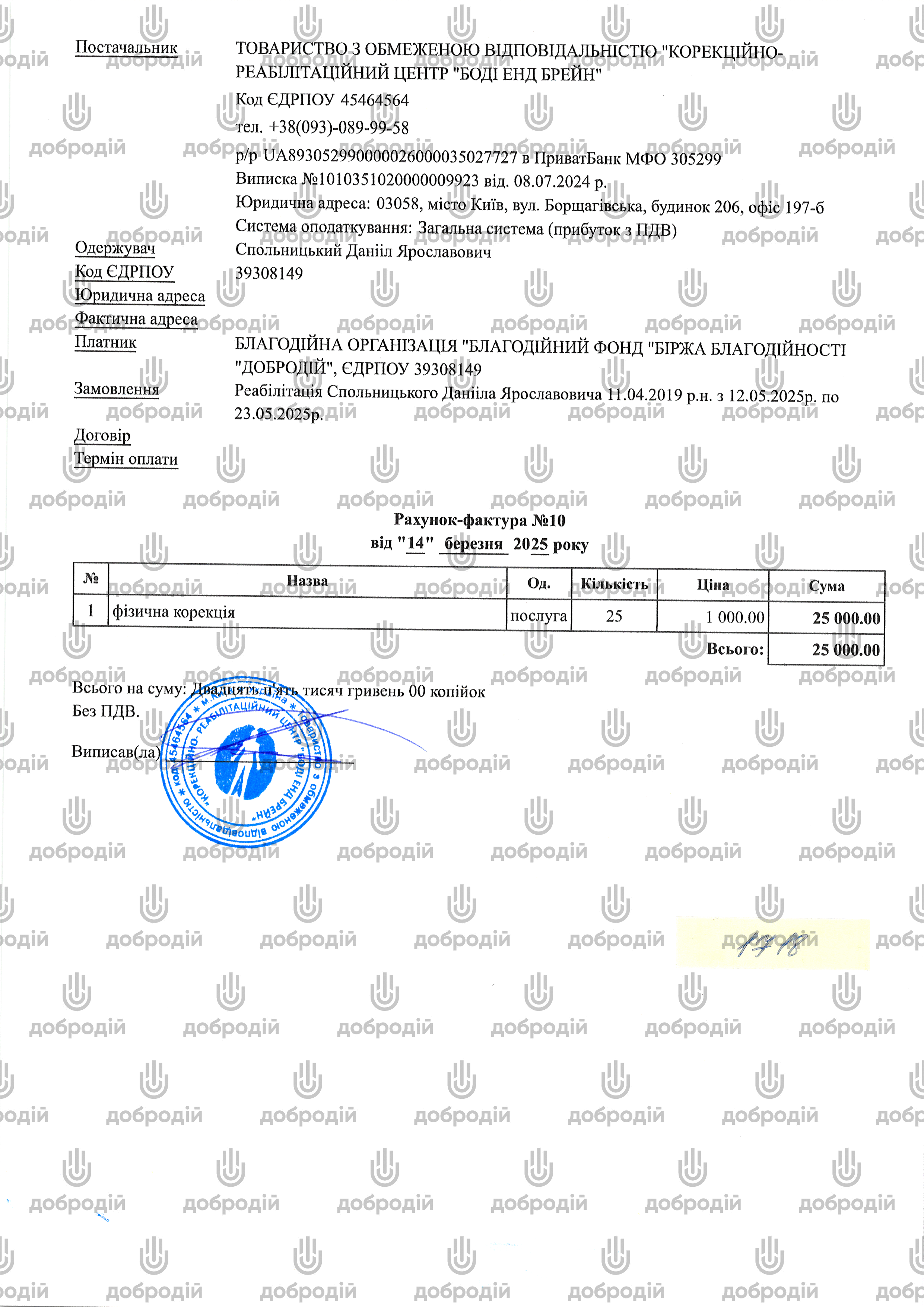Призначення платежу: «Благодійний внесок для Спольницького Даніїла (проєкт № 1718)»