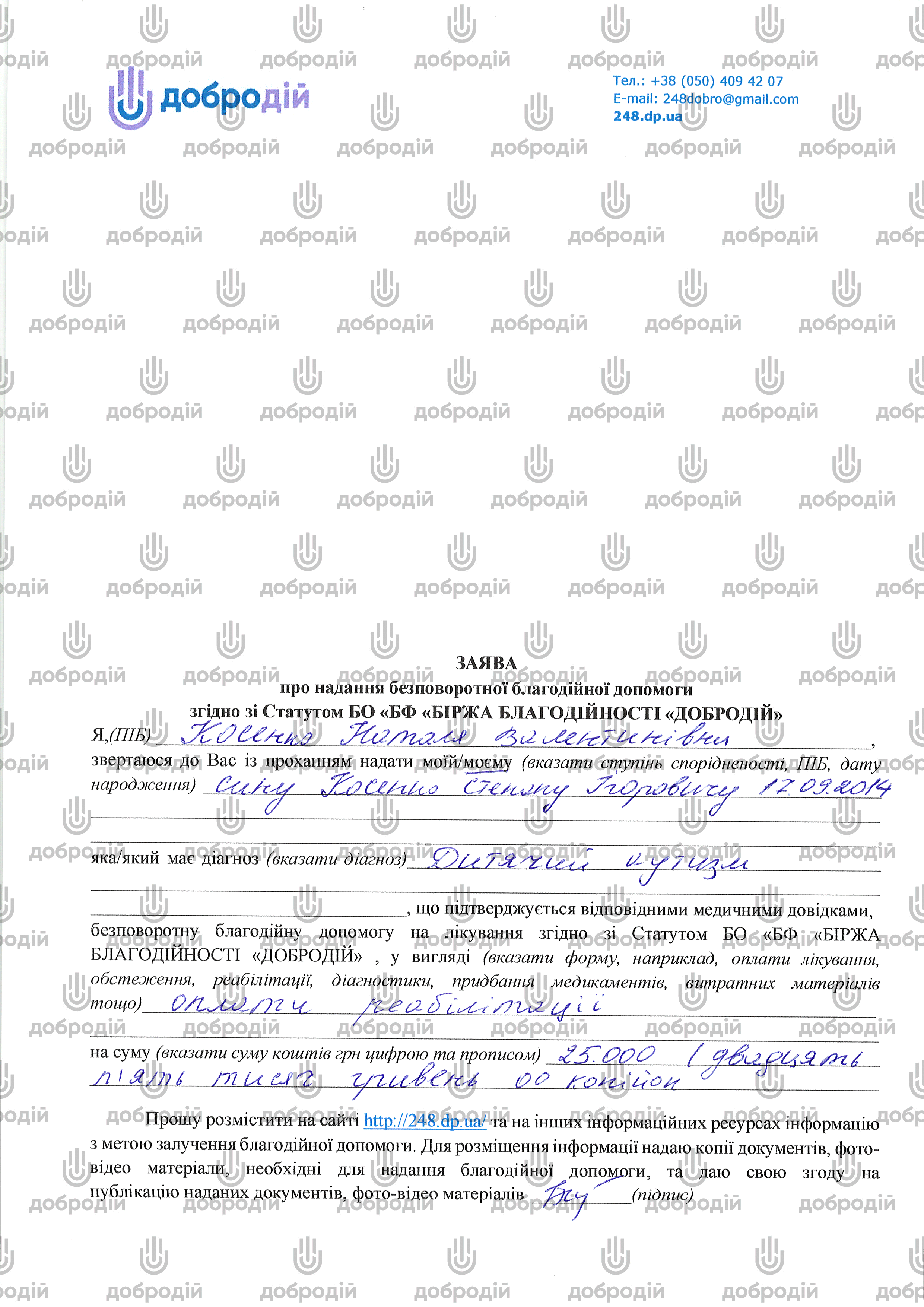 Мета проєкту: зібрати 25 000 грн на оплату курсу реабілітації у Медичному центрі «Space clinic» (ФОП Кушнірська О.Є.)