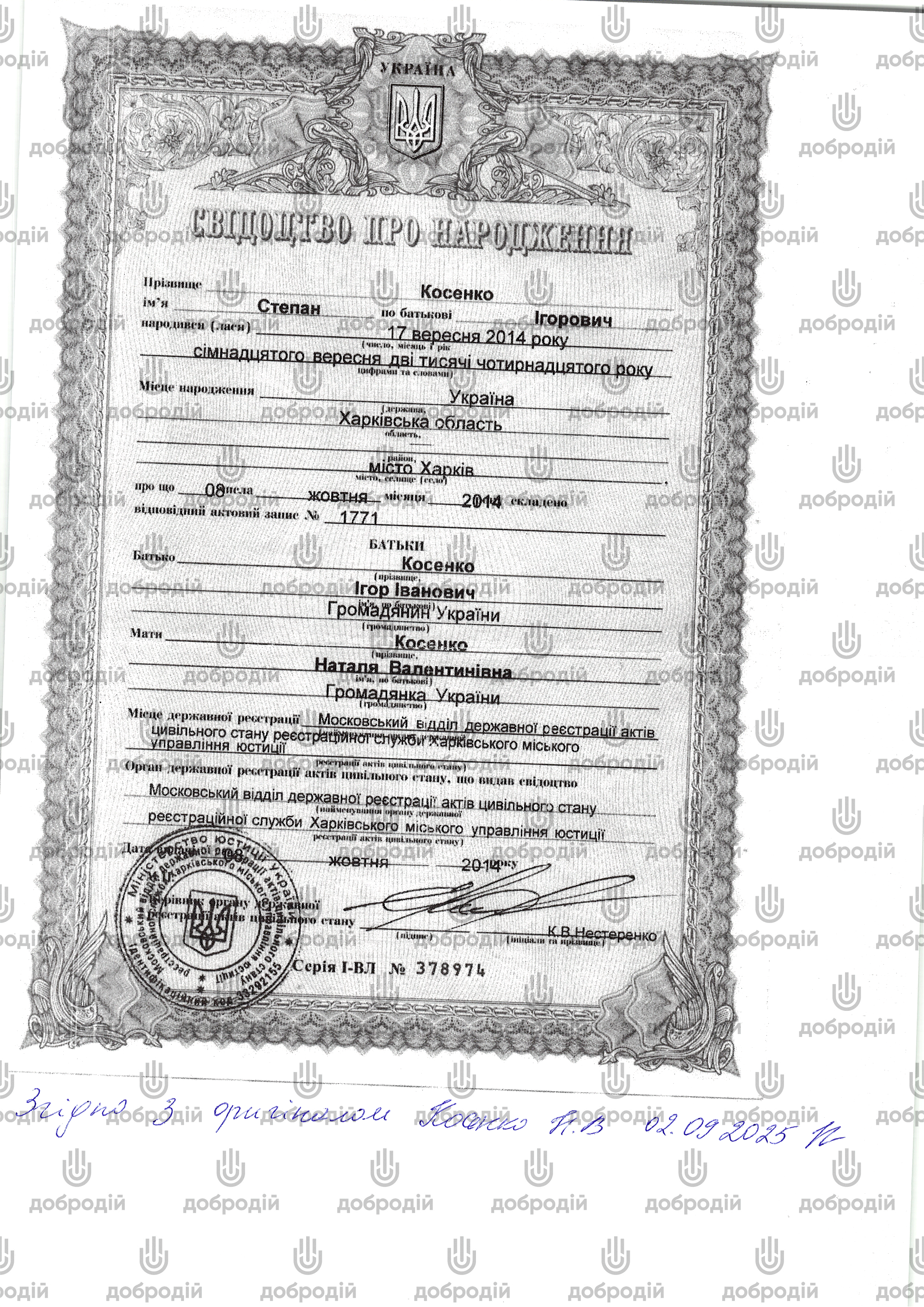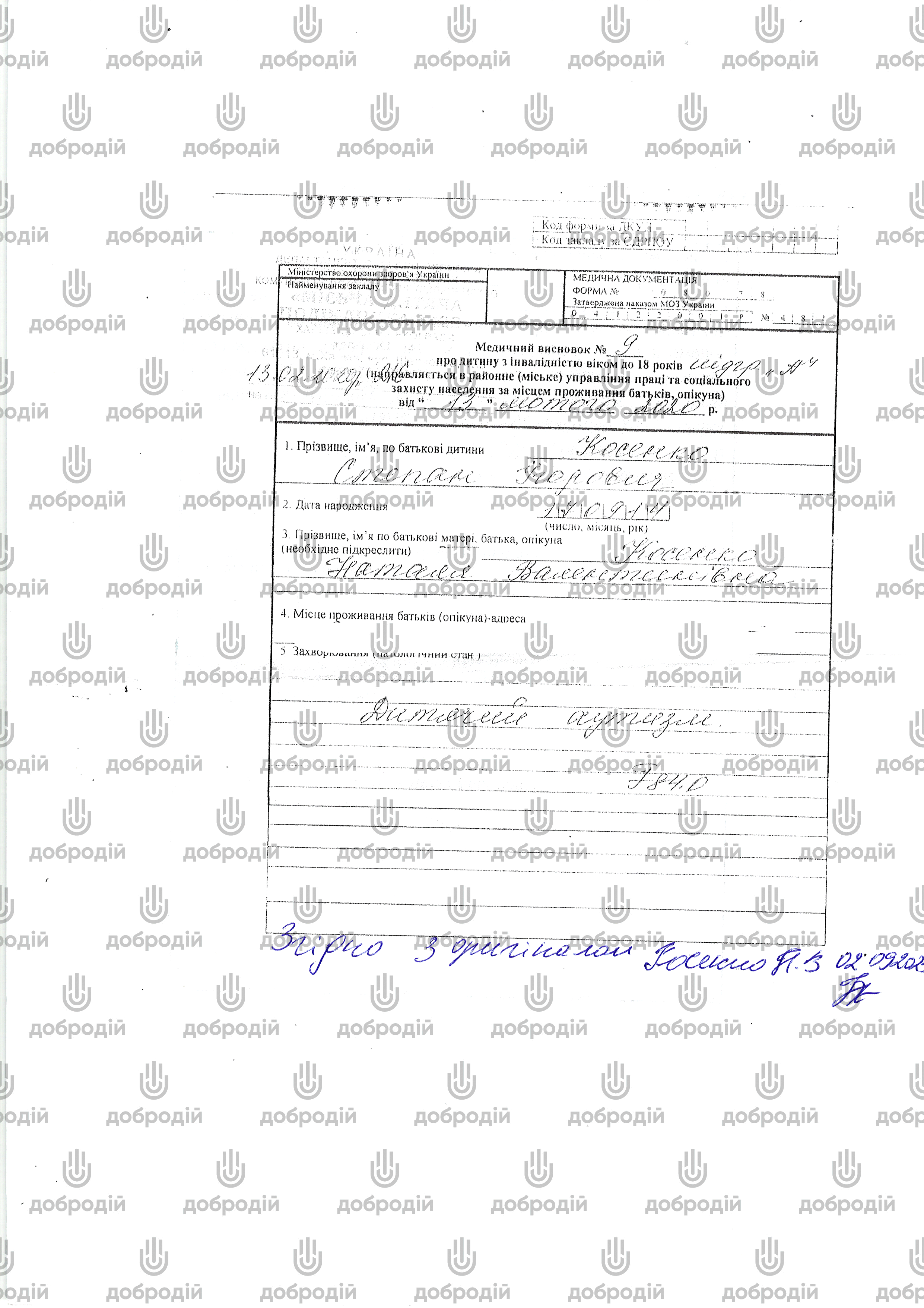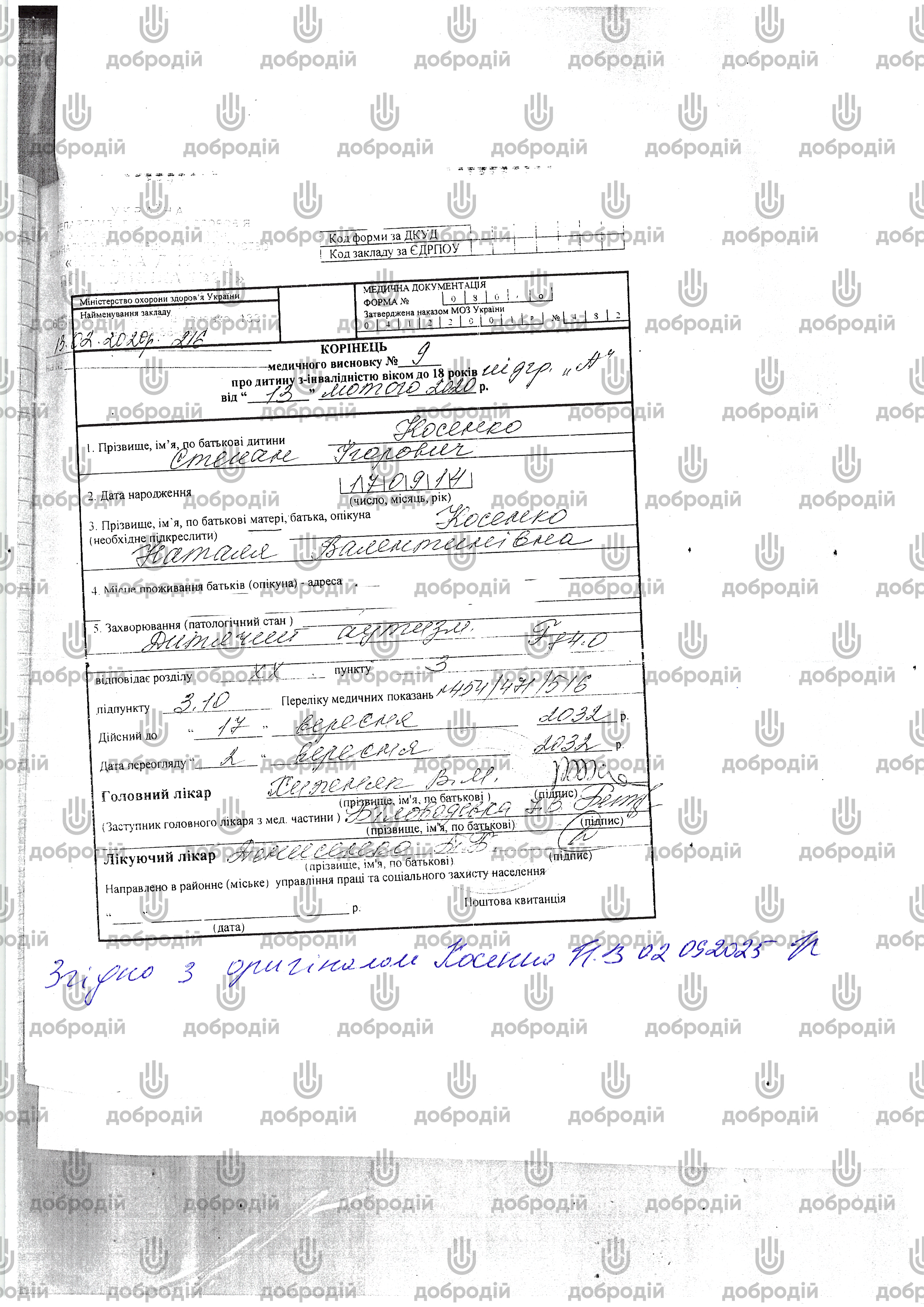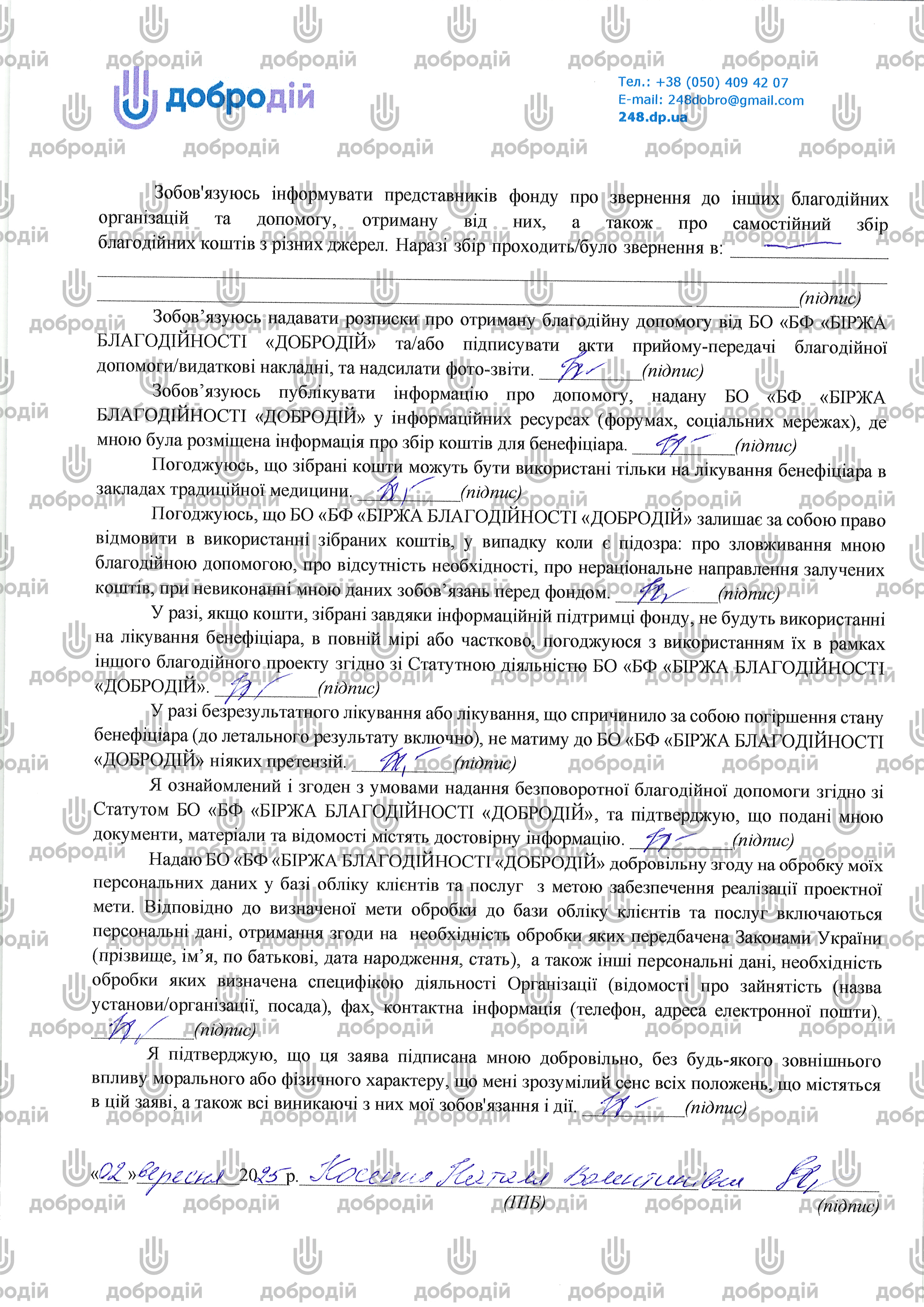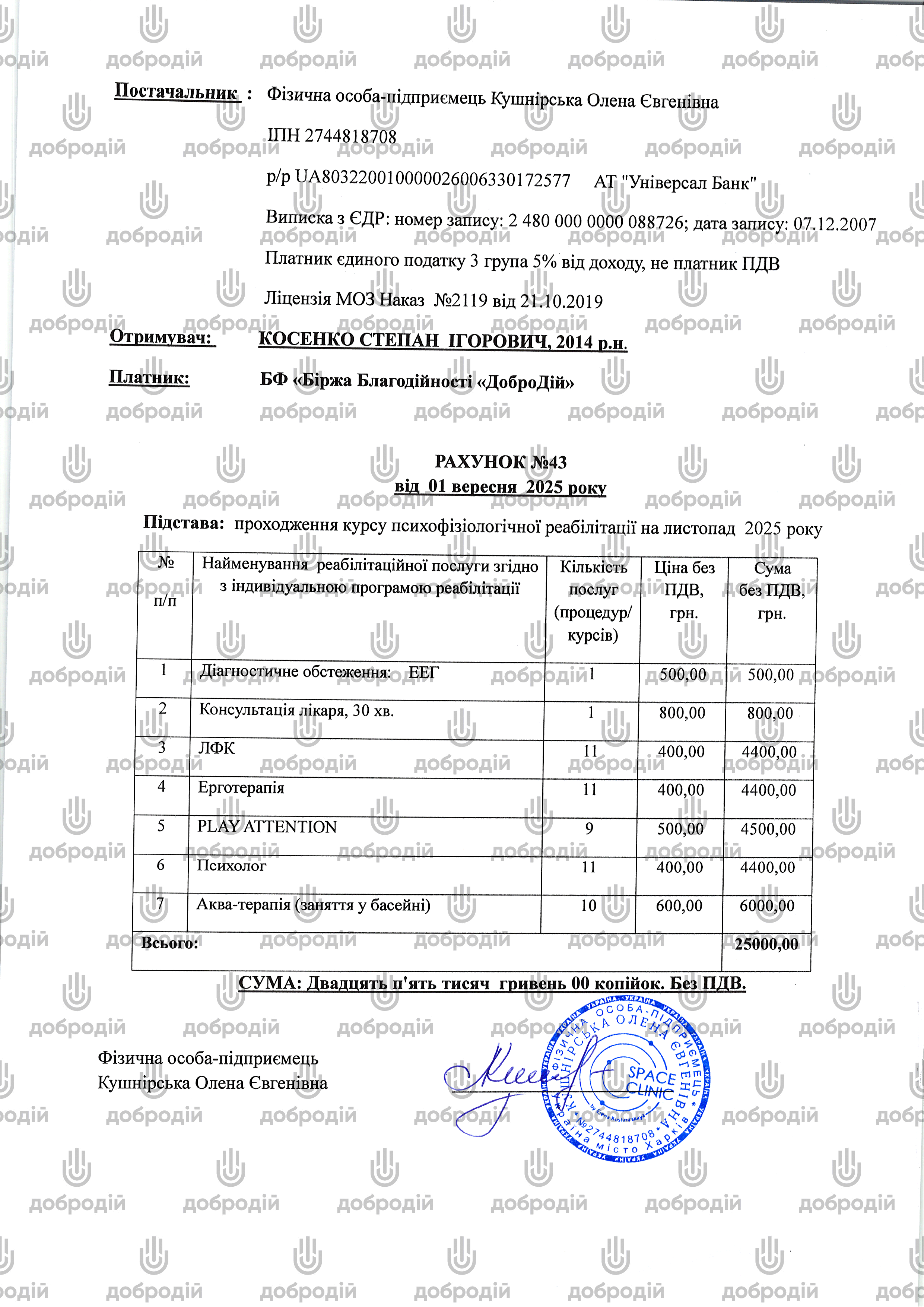 Призначення платежу: «Благодійний внесок для Косенка Степана (проєкт № 1829)»