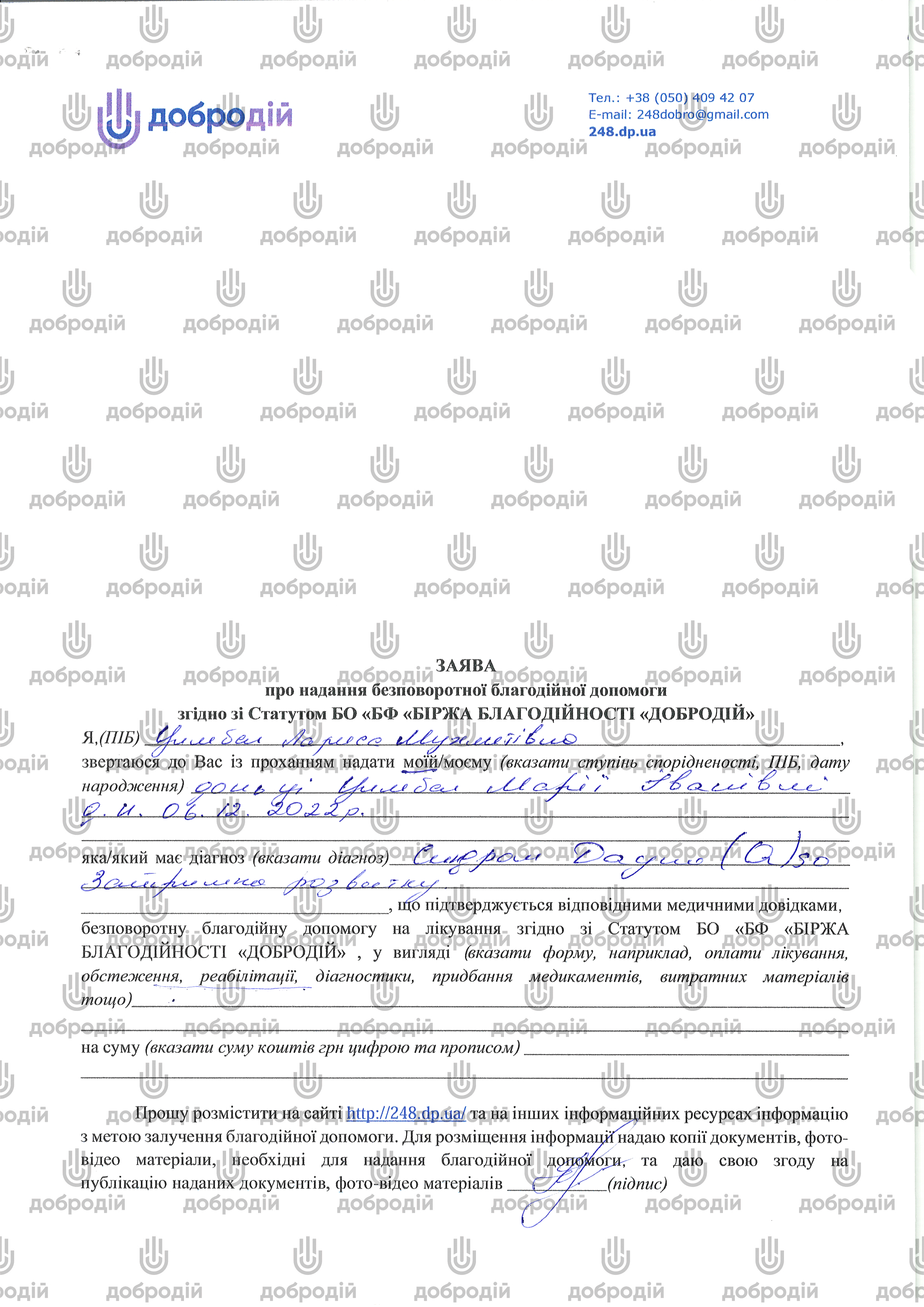 Перший місяць життя Марічка провела в реанімації під апаратом ШВЛ. Дитина народилася зі зниженим тонусом м’язів та була дуже слабкою. Обстеження виявило у неї вроджену ваду серця, і вже у 7 місяців Марія перенесла складну операцію на серці. Дівчинка отримує безлактозне та безглютенове спецхарчування, часто хворіє, має дуже слабкий імунітет.