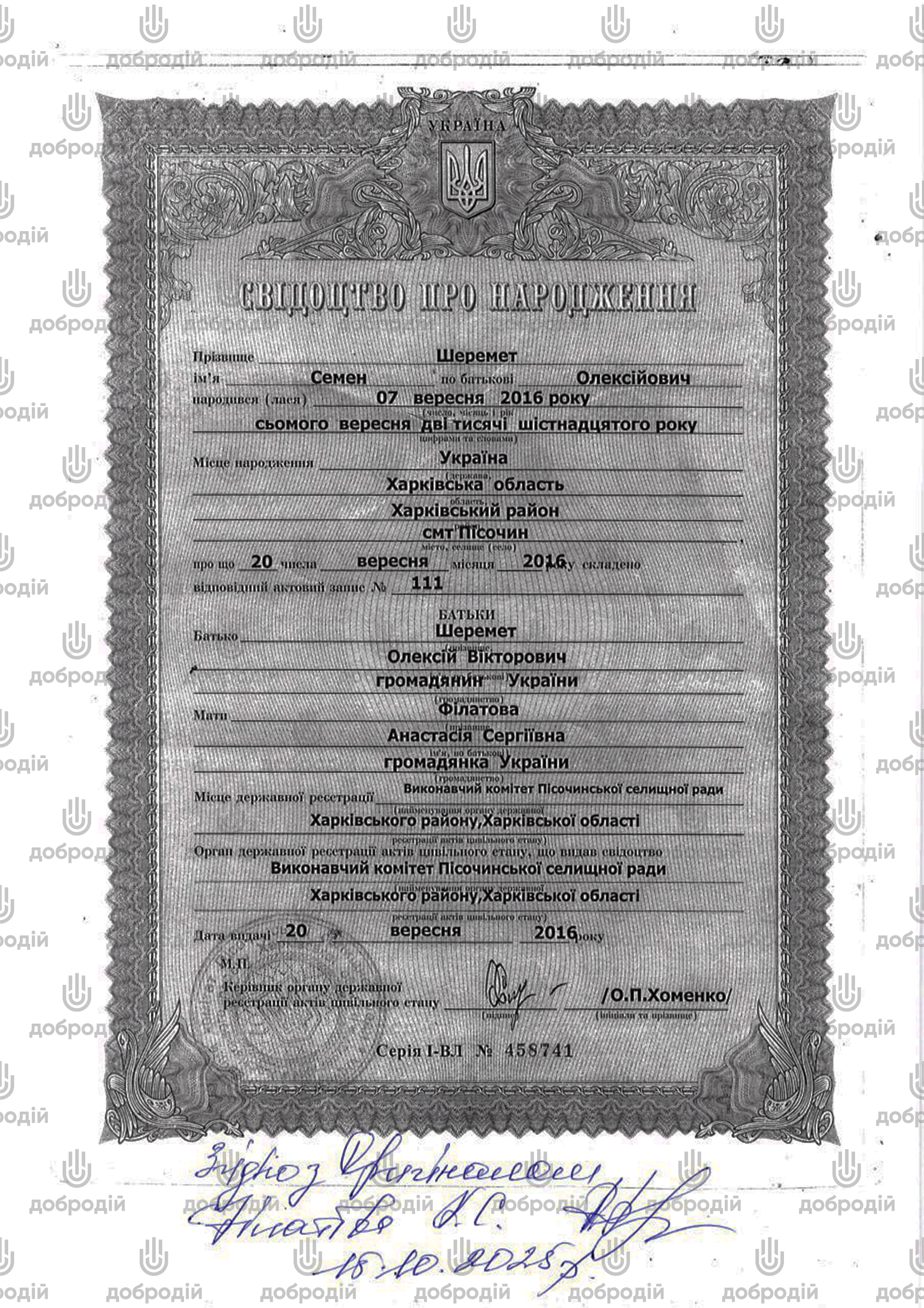 Призначення платежу: «Благодійний внесок для Шеремети Семена 1841)»