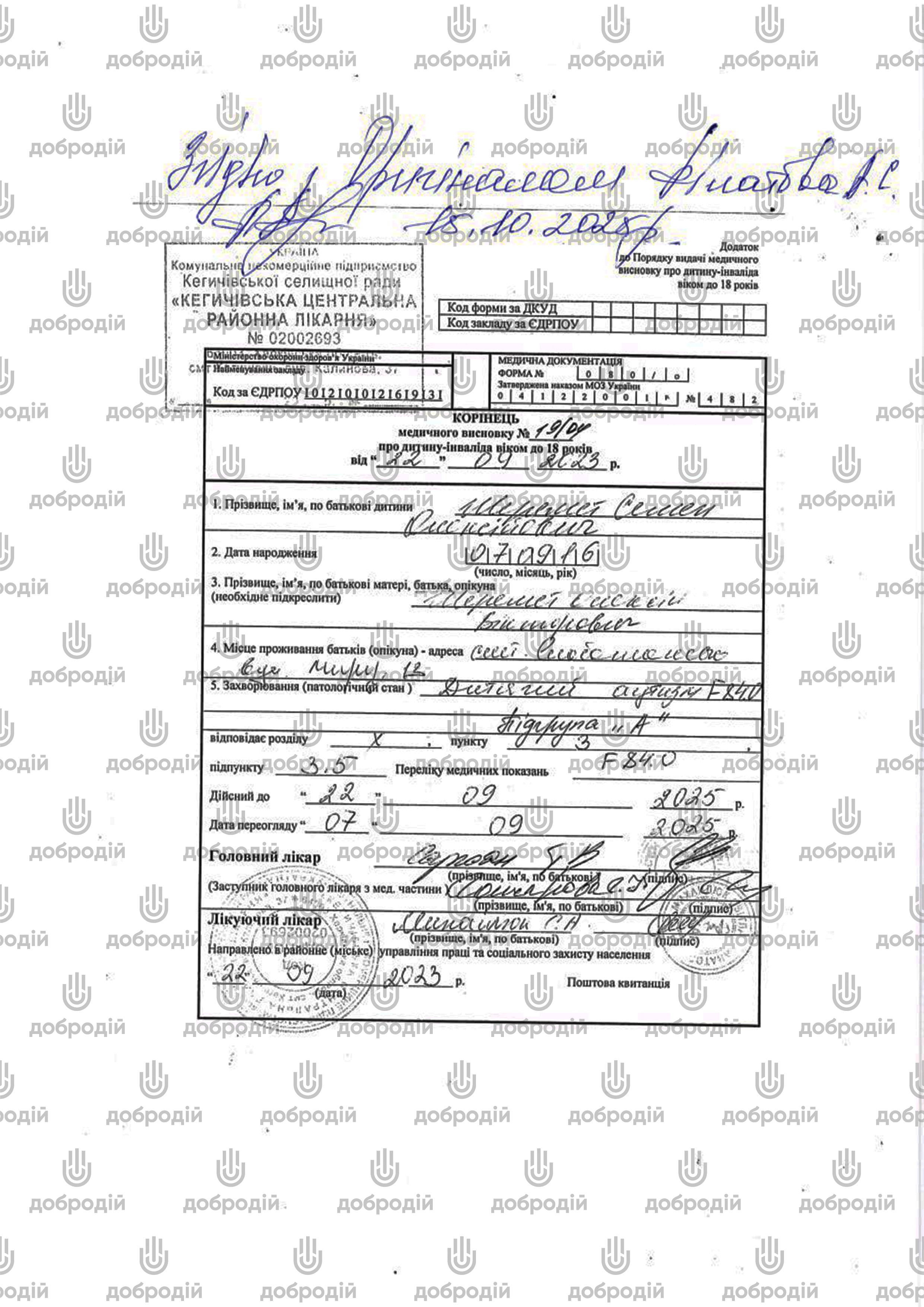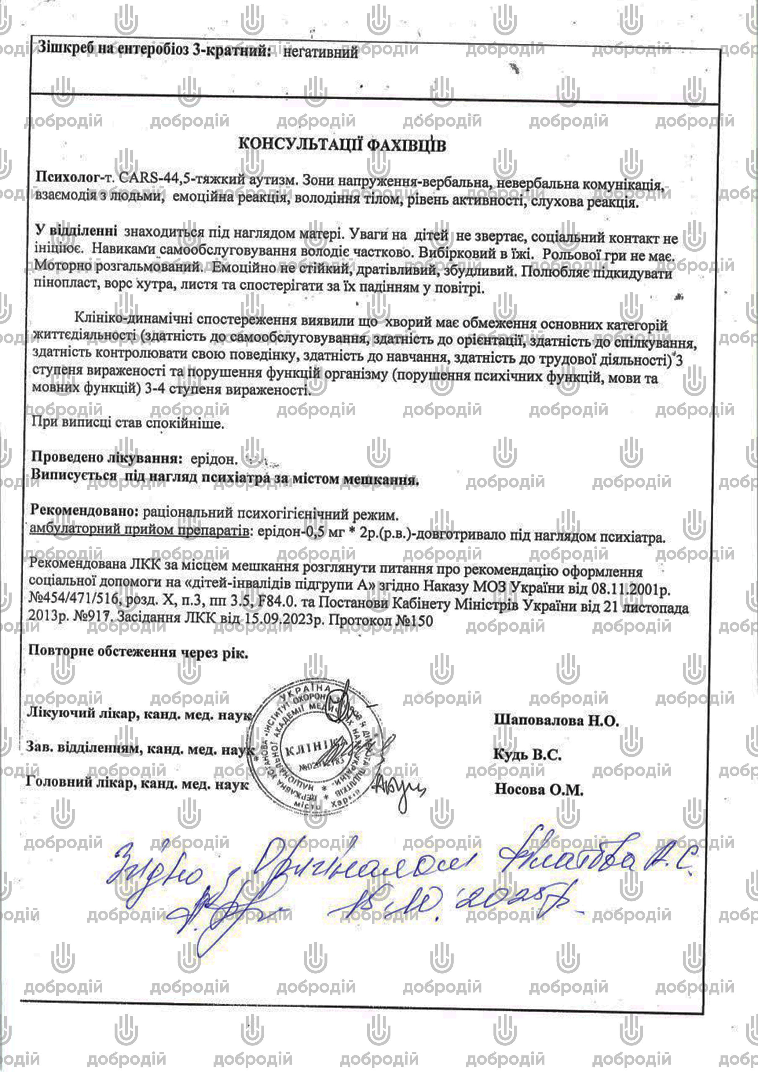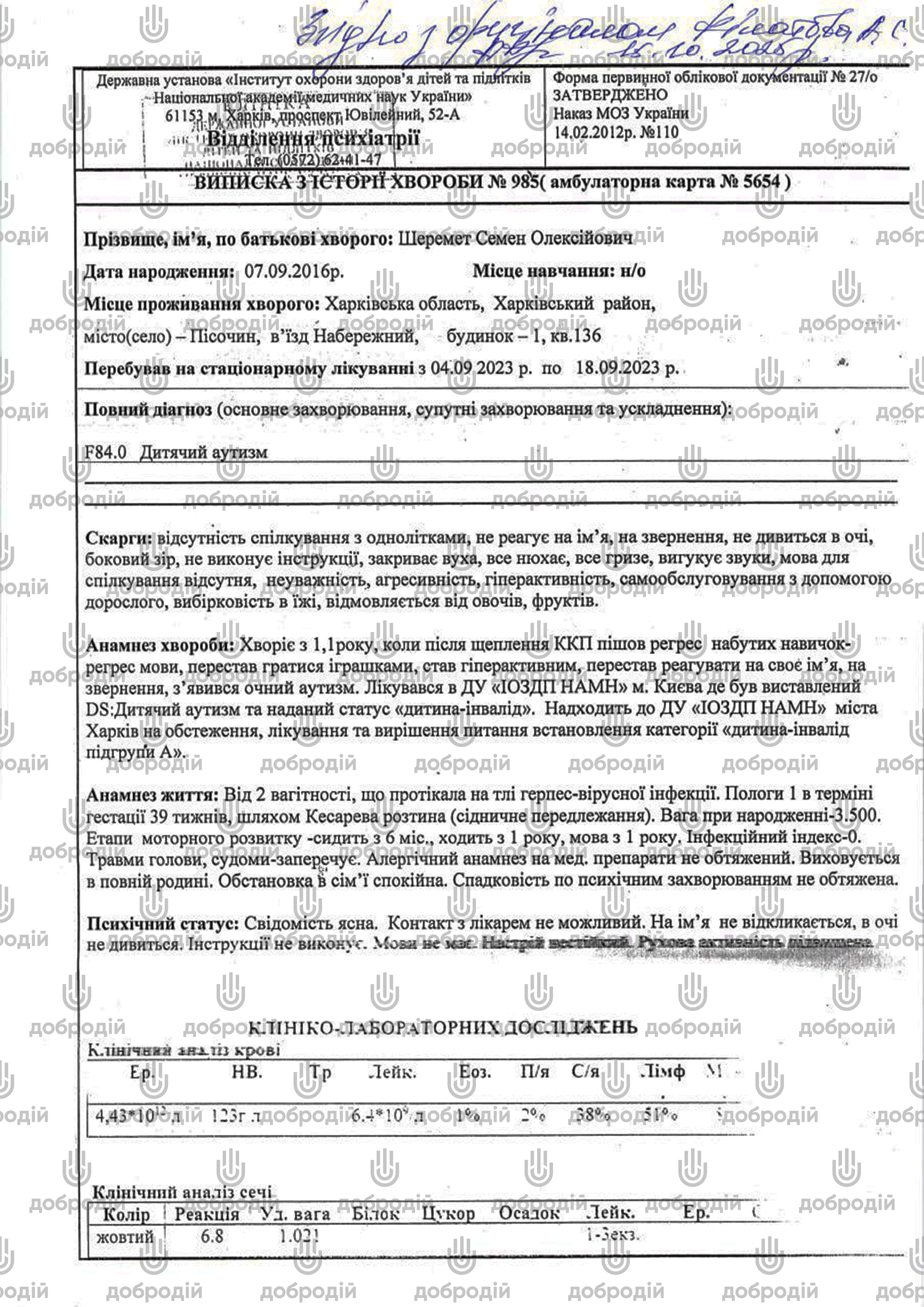 Діагноз: Дитячий аутизм. Системне недорозвинення мовлення. Синдром дефіциту уваги з гіперактивністю. Ознаки дисплазії сполучної тканини.