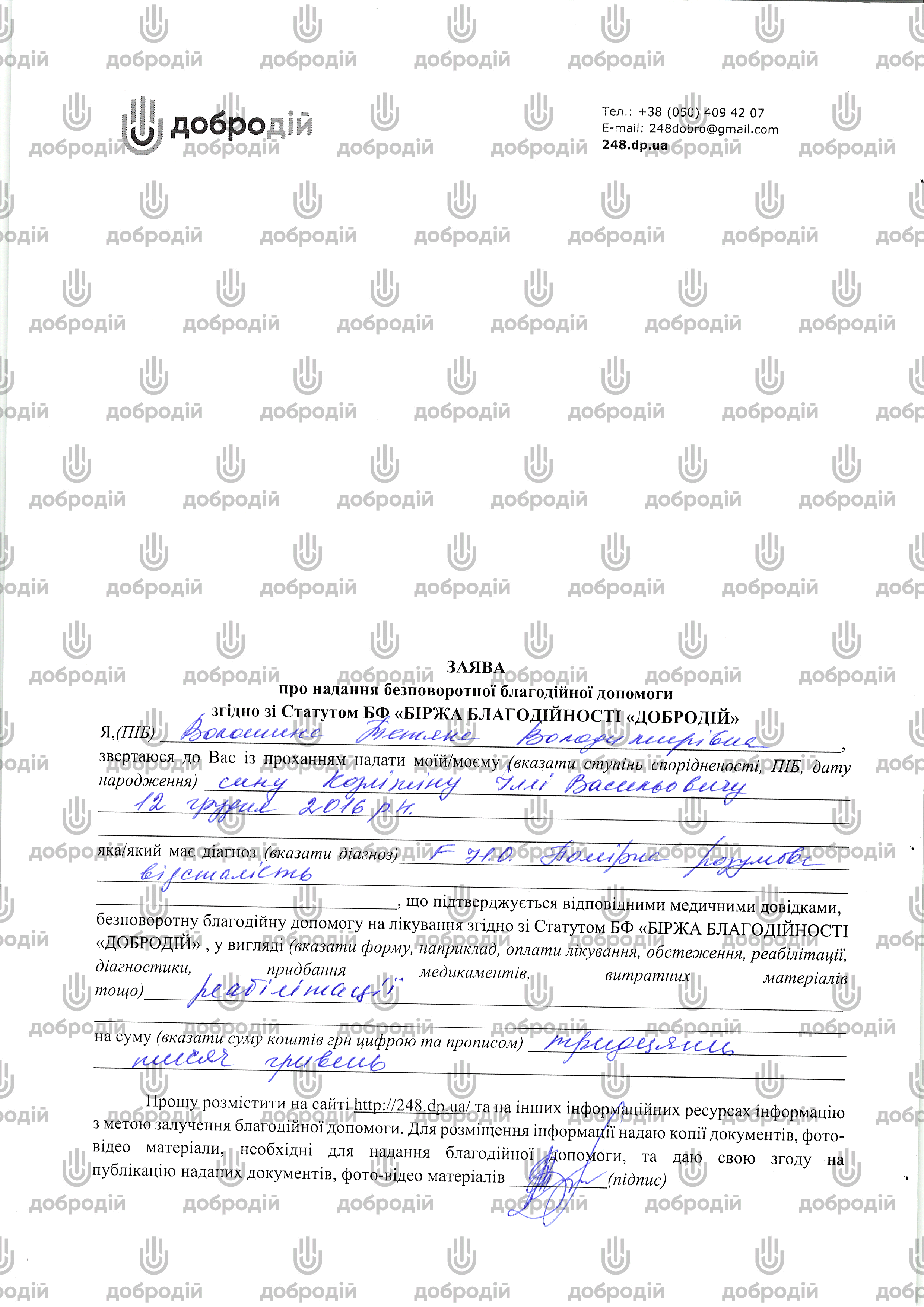 Мета проєкту — залучити 30 000 грн для оплати реабілітаційних послуг в корекційному центрі ТІМ