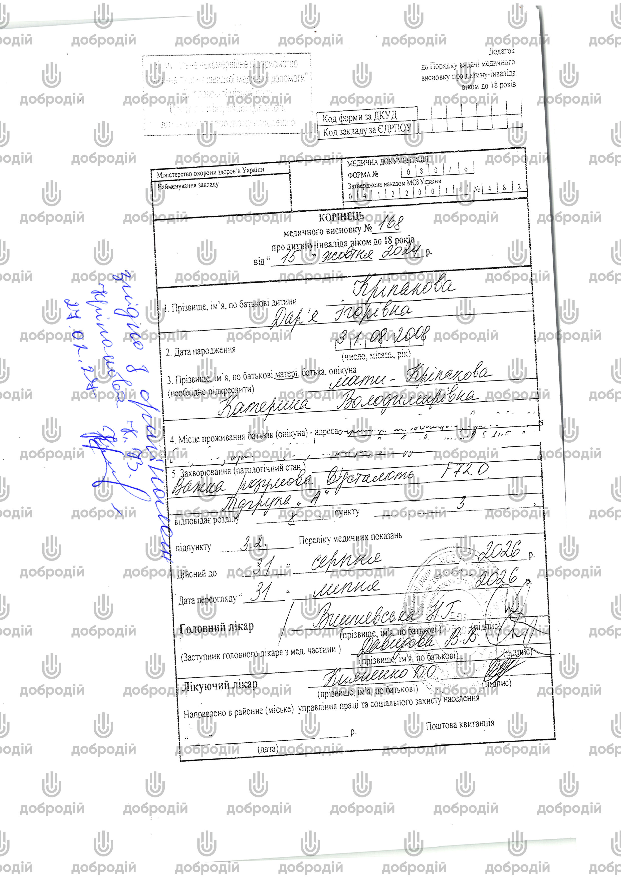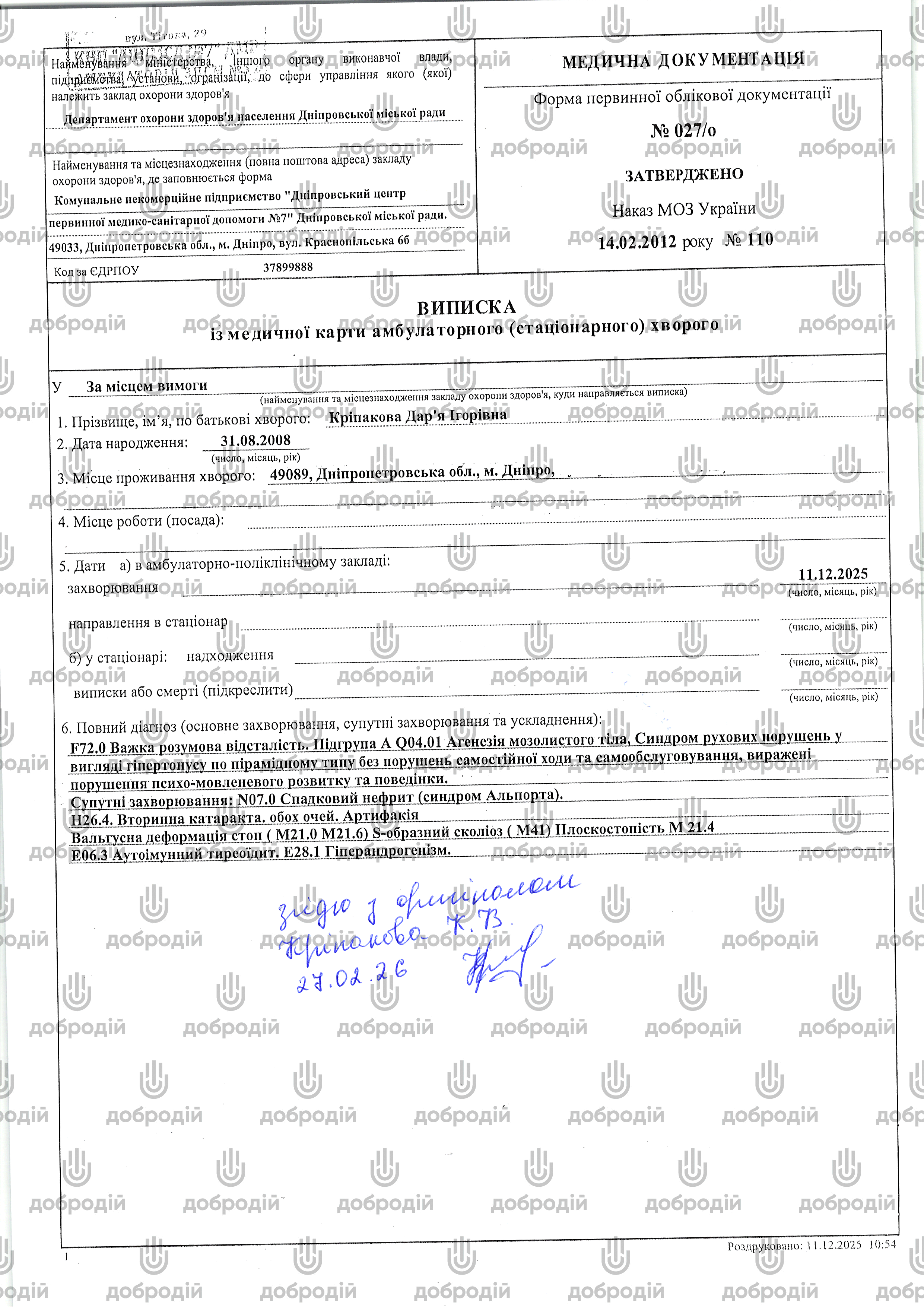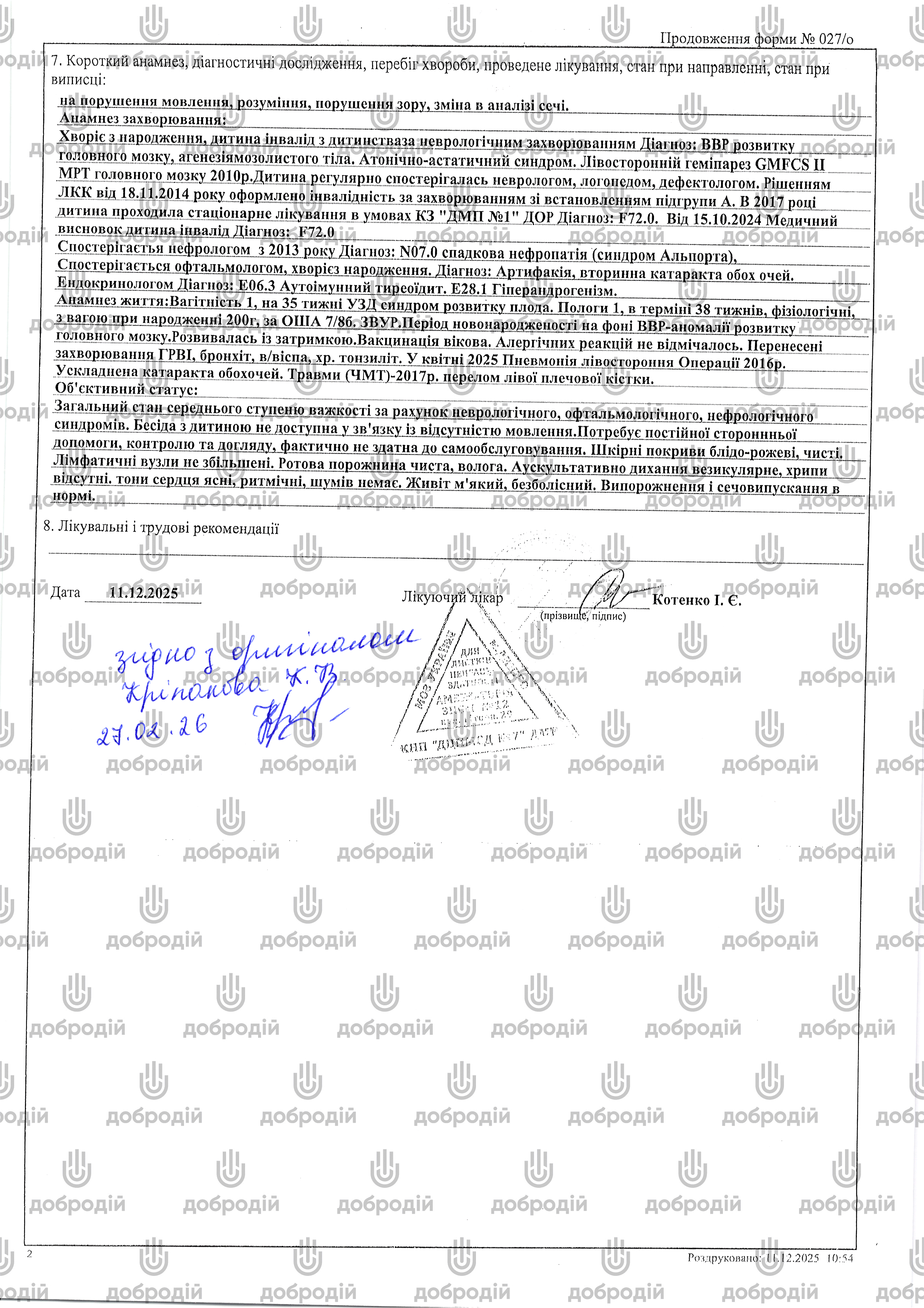 Діагноз: Важка інтелектуальна недостатність (F72). Агенезія мозолистого тіла. Синдром рухових порушень у вигляді пірамідного гіпертонусу без порушення самостійної ходи та самообслуговування, виражені порушення психомовленнєвого розвитку та поведінки. Вальгусна деформація колінних суглобів і стоп (M21.0, M21.4). S-подібний сколіоз І ступеня (M41).