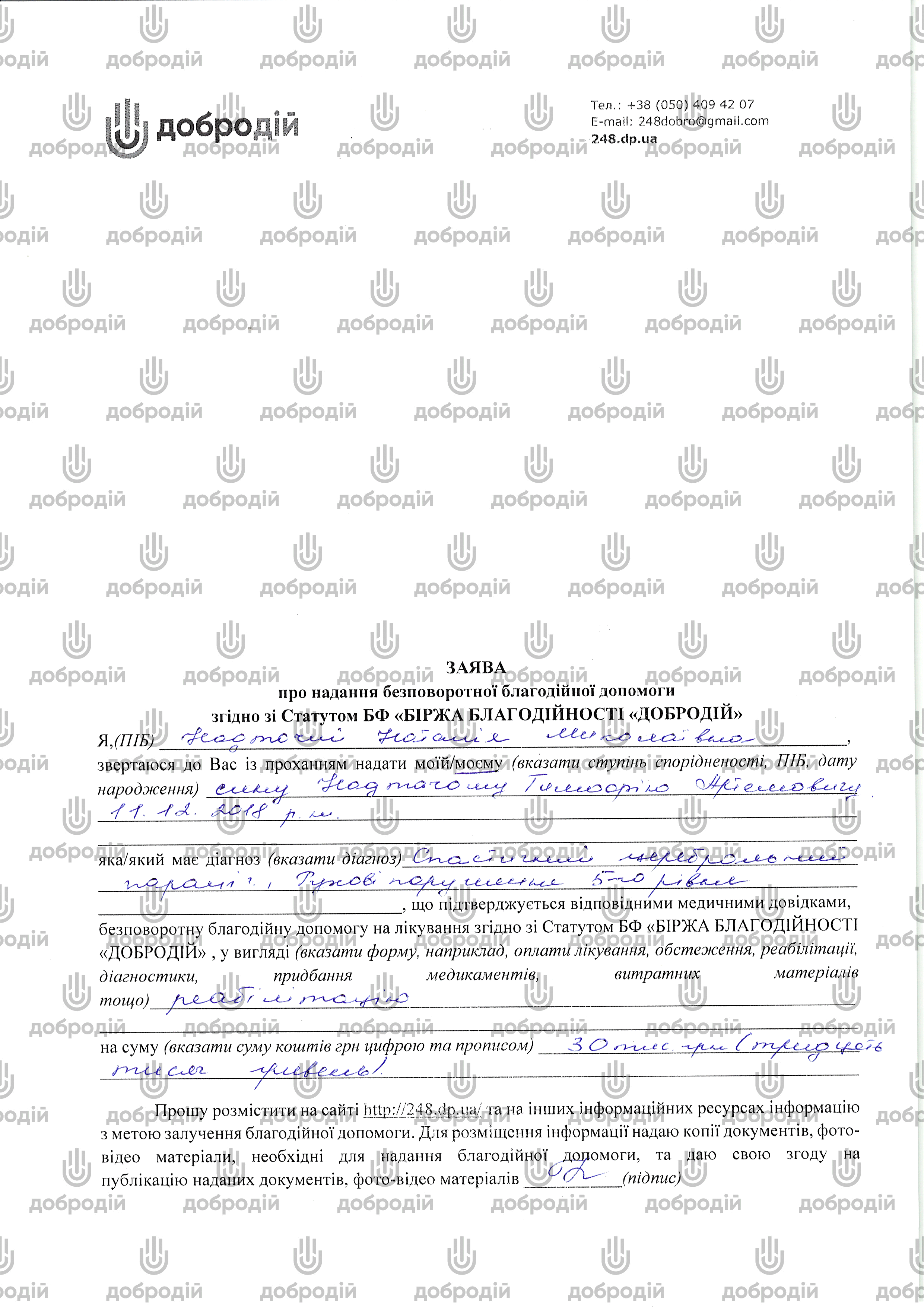 Призначення платежу: «Благодійний внесок для Тимофія Надточого (проєкт № 1870)»