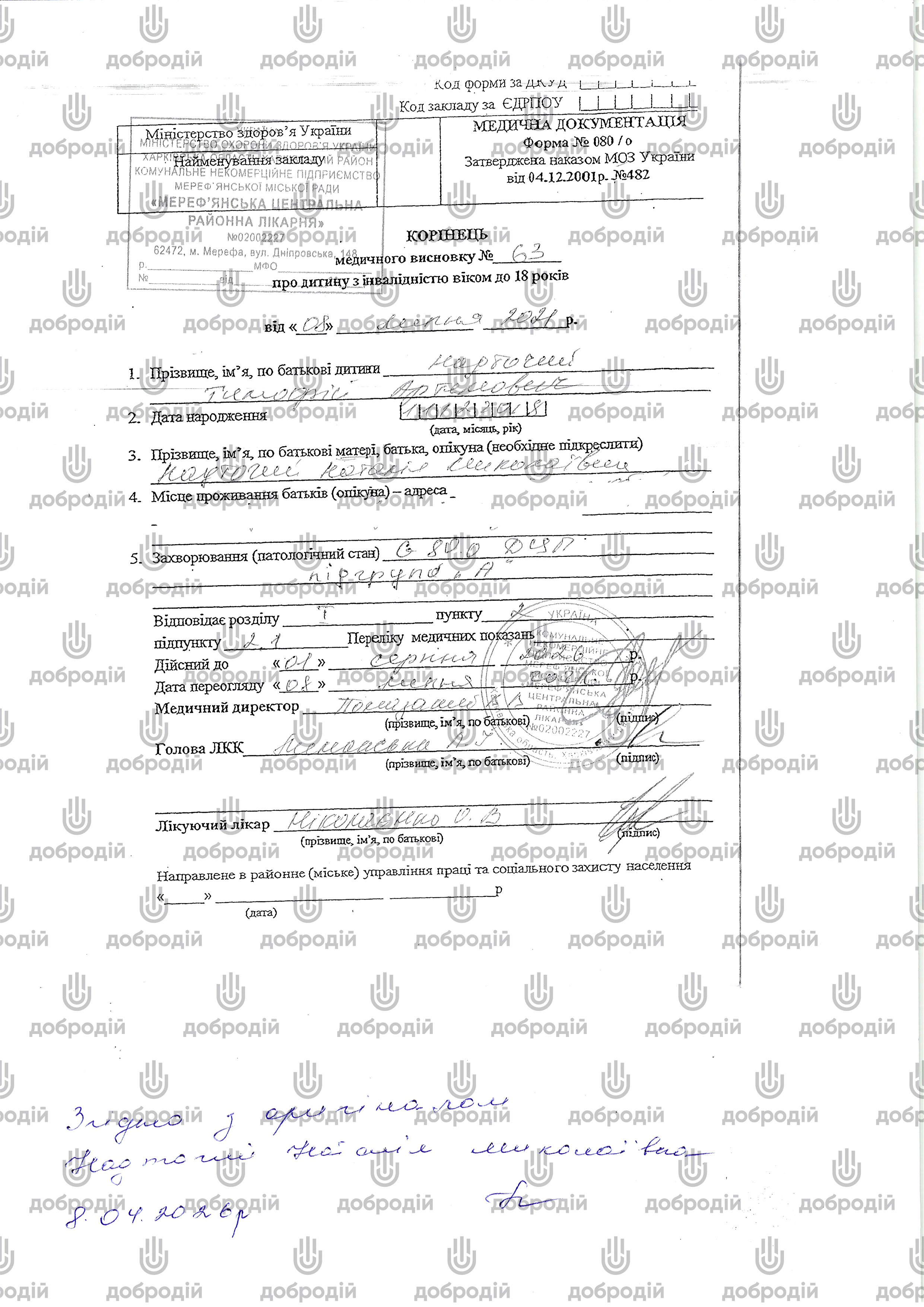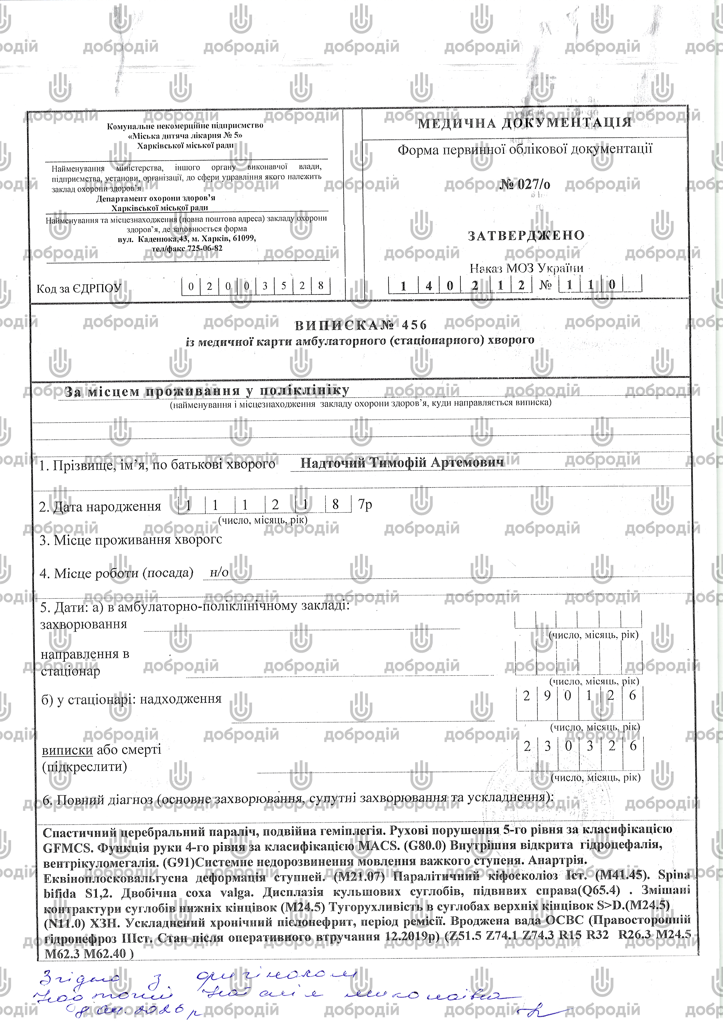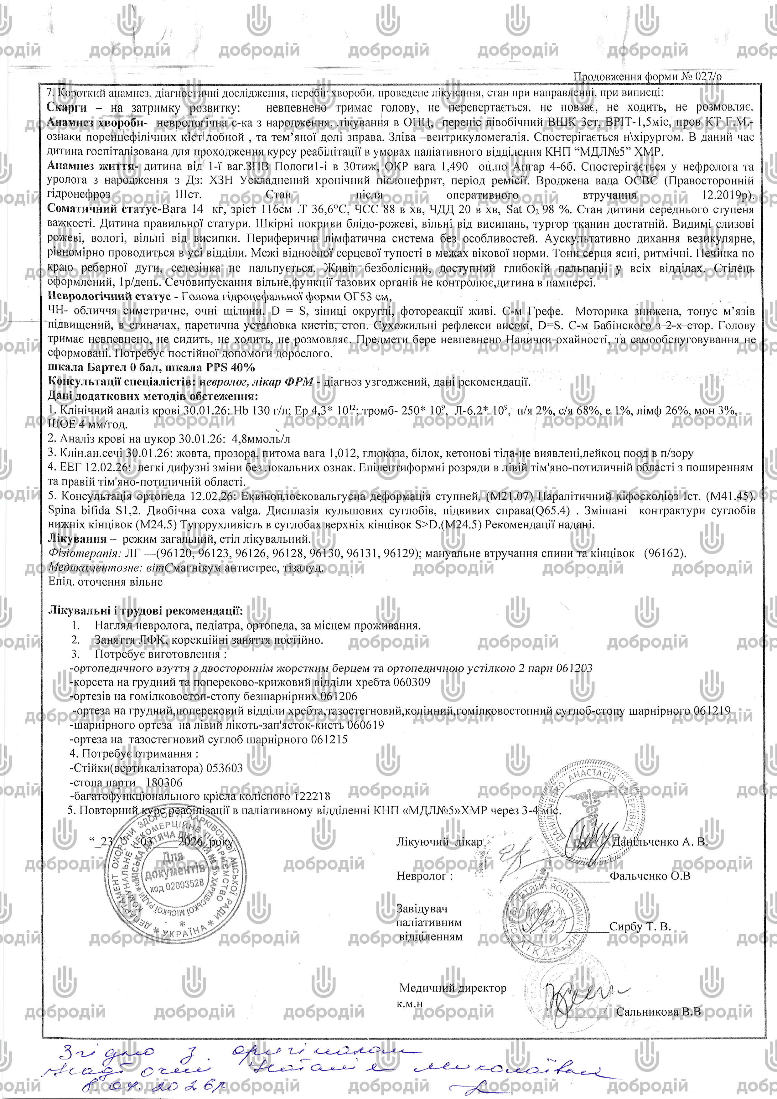 Діагноз: Дитячий церебральний параліч, спастична форма, подвійна геміплегія. Рухові порушення V рівня за GMFCS, функція руки — IV рівень за MACS. Внутрішня відкрита гідроцефалія, вентрикуломегалія. Системне недорозвинення мовлення важкого ступеня.